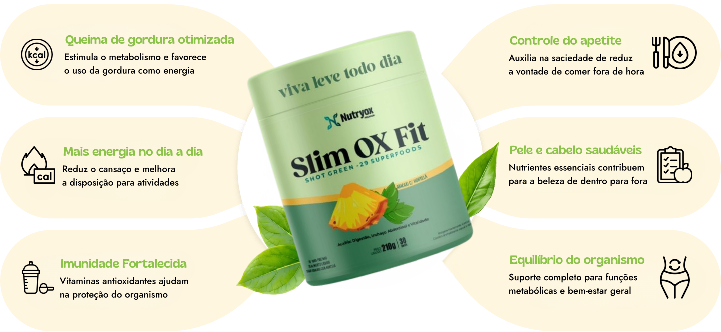 Slim OX Fit é um suplemento funcional que combina fibras prebióticas, superfoods e ativos naturais para auxiliar na digestão, saciedade e metabolismo.